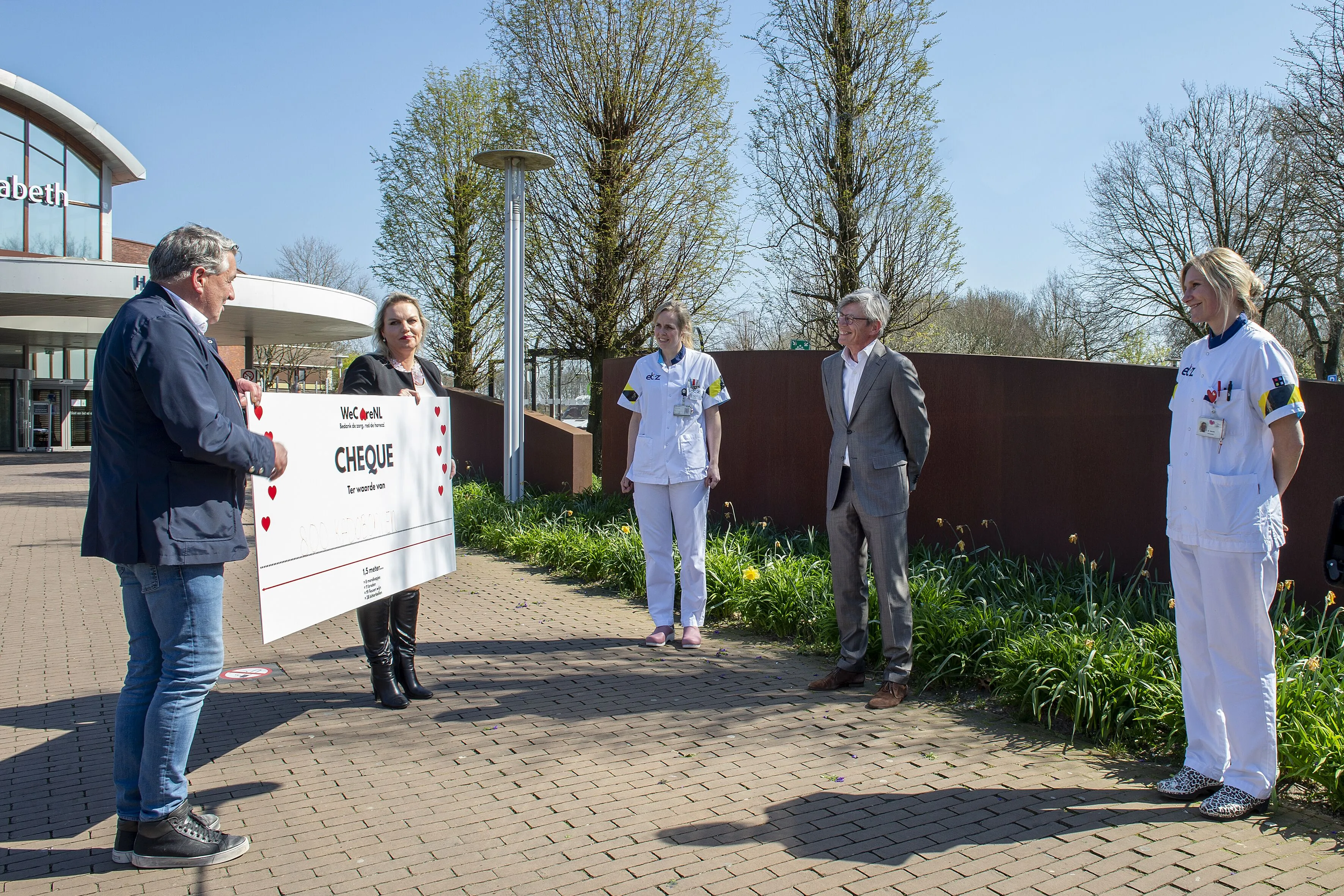Onder aanvoering van ambassadeur Robèrt van Beckhoven werd deze week de eerste cheque van €20.000 symbolisch uitgereikt aan Bart Berden van het ETZ. De actie is bedoeld voor alle medewerkers in de gehandicapten-, ouderen- en ziekenhuiszorg. “Dankzij betrokken bedrijven zoals de Rabobank en vele publieksdonaties op www.wecarenl.nl is deze mooie tussenstand bereikt. Nu starten we in verschillende gemeenten met een lokale groepje mensen dat WeCareNL promoot, bedrijven hieraan verbindt en de mensen oproept te doneren. Deze massale ondersteuning in Midden-Brabant is een fantastische uitkomst!”, aldus een enthousiaste initiatiefnemer Jordy Sweep.